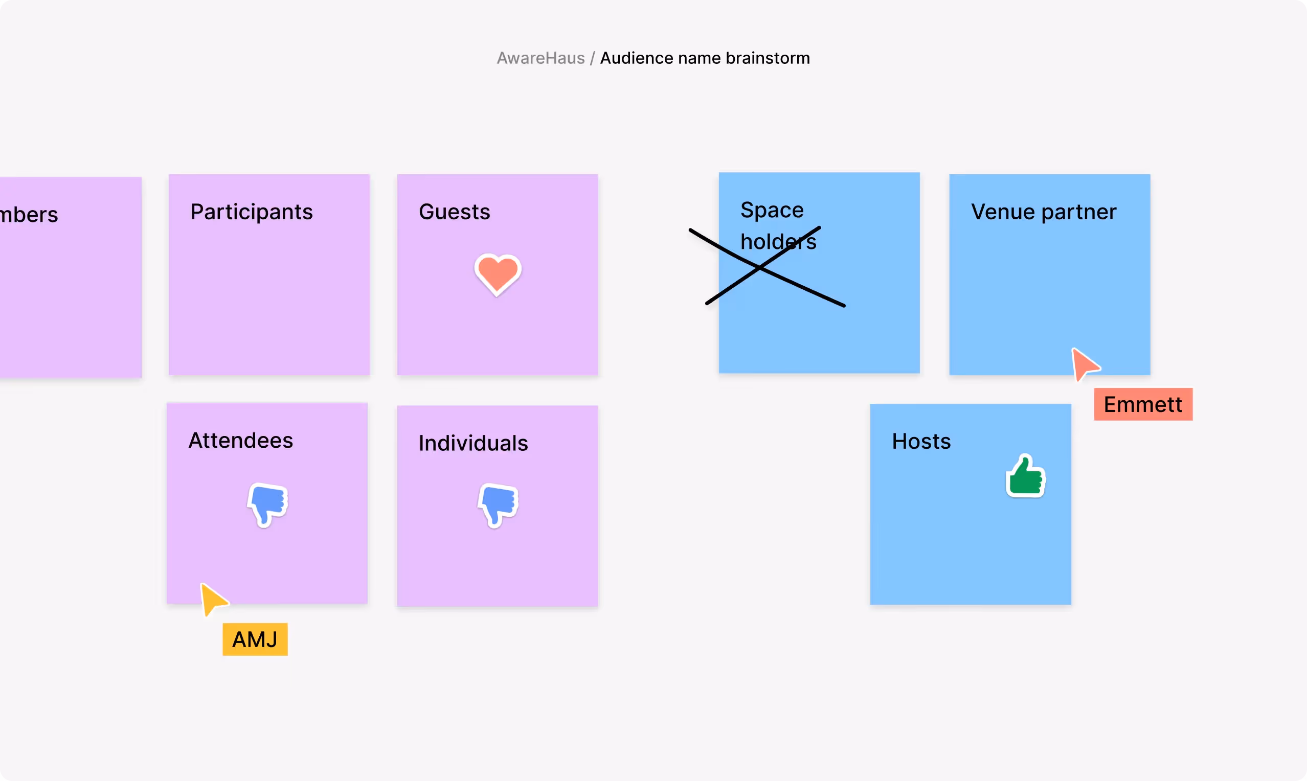 We began by clarifying AwareHaus’ audience. The platform serves three distinct but connected groups—guests, guides, and hosts (those offering physical spaces). We intentionally chose language that felt relational rather than transactional, reflecting the community’s spirit of shared care and creativity.